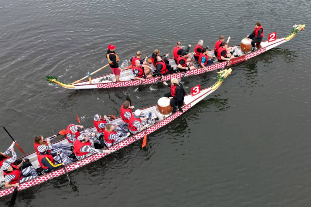 A Dragon Boat Race is a fun water sports activity where teams of between 7 – 11 people sit in pairs and paddle to compete in races over distances. Each boat has a drummer beating time to keep the paddlers in unison, and a professional helmsperson to guide the boat (this will be one of Race the Dragon’s team). Each team will take part in a minimum of 3 races, where they paddle approximately 200m. Each race takes about 1 – 1.5 minutes to complete.