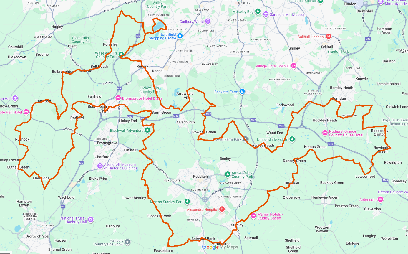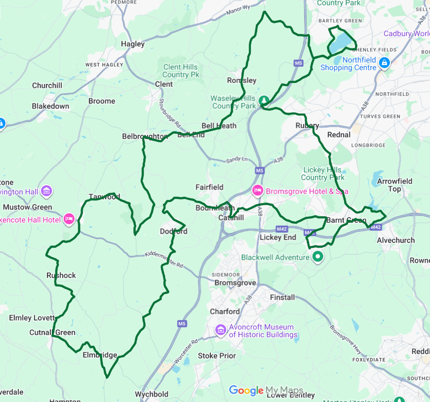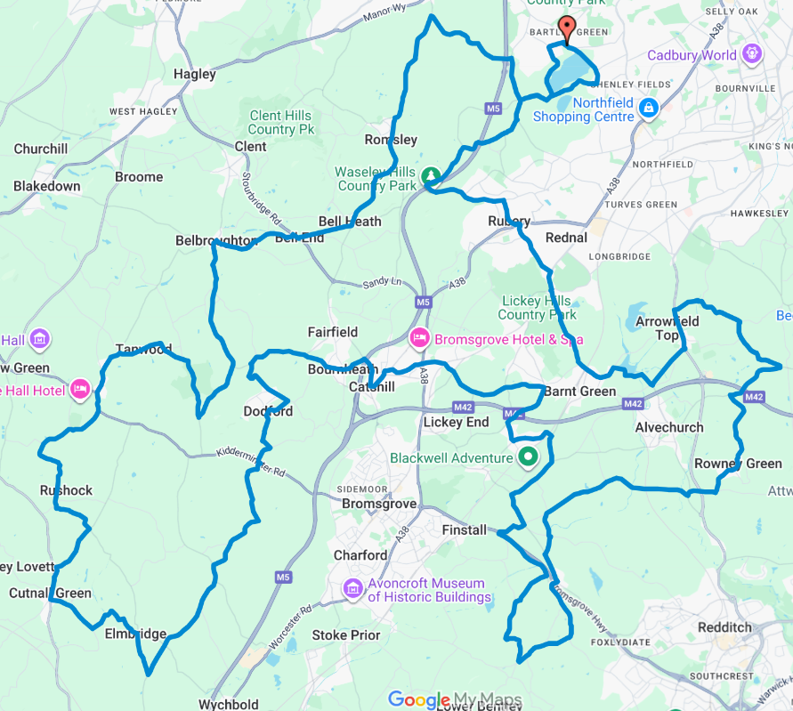 This route is an extended version of our ever popular 75km route. At Barnt Green, cyclists will leave the 75km route, travelling through Tutnall, Beoley and Alvechurch before rejoining the intermediate route towards the Lickey Hills and onwards to the finish line at Newman University.